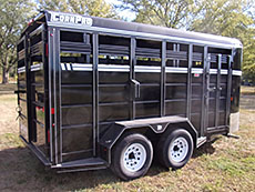 | 2026 Corn Pro 6' x 16' Stock, 6'-6" high, 2-3500# torsion axles, center swing gate, slider rear gate, $8400. |