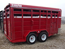 2022 Golden (by Corn Pro) 72" x 12', 2990# GVW spring axle, 15" bias tires, 2" coupler, mesh gate will lay flat on floor. $2850. Reduced to $2650. | 2026 Corn Pro 79" x 12' Utility, 3500# torsion axle with brake, 2-5/16" coupler, split mesh Ramps, $3550. | ||